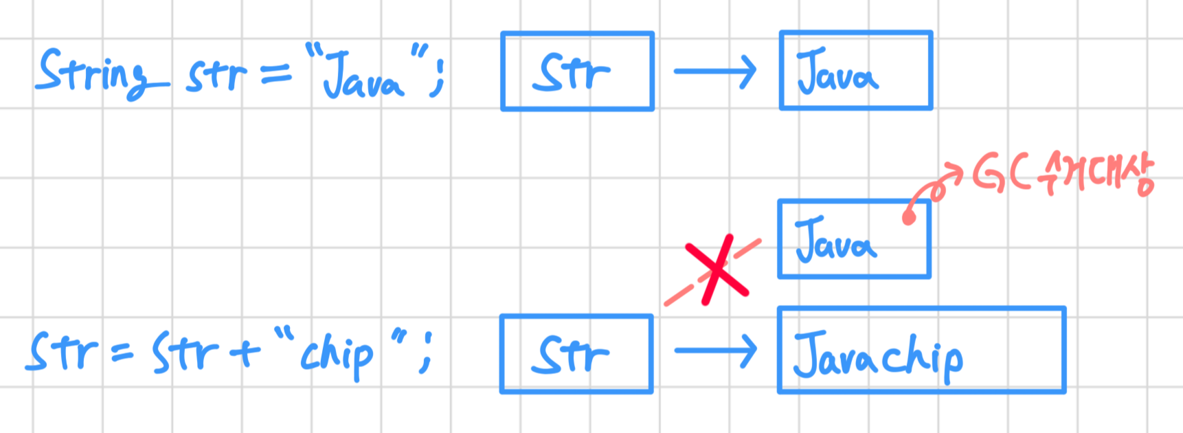 하지만 실제로는 기존의 "java" 를 저장한 메모리 영역은 str 과의 참조가 끊어지면서 GC 의 수거대상이 됩니다. "java" 를 저장한 메모리 영역이 "javachip" 으로 변경되는 것이 아닙니다.