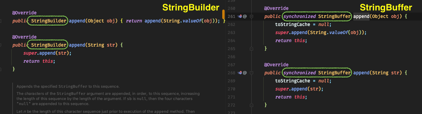 StringBuilder, StringBuffer 클래스 내부 메서드 선언 부분. 동일한 로직이지만 synchronized 의 유무 차이가 있다.