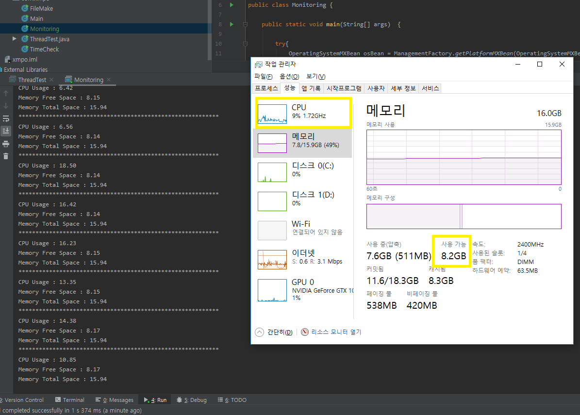 아래는 작업관리자에서 확인 할 수 있는 CPU사용률과 메모리 수치와 비교해보았습니다.